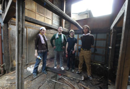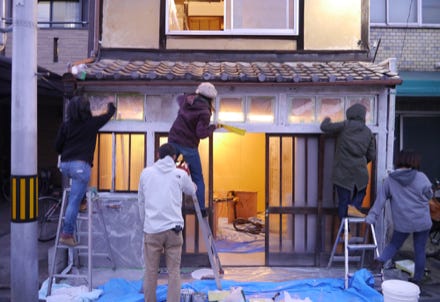 Project to renovate a vacant house in Kyoto into an office and gallery for HAPS, an organisation that supports young artists HAPS aimed to balance the issue of vacant houses and support for artists by renovating vacant houses by artists themselves and turning them into studios and living spaces. Therefore, it was decided to regard the creation of a base for HAPS as a pilot project and to aim to renovate the townhouse in a workshop format. As architectural experts, we decided on the details of the refurbishment, drew up a process and construction plan that allowed the participation of laypeople, and provided on-site guidance. We are now attempting to determine the details and create a record of the project with the theme of traceability, so that it can later be used as a reference case for artists who want to utilise vacant houses. By involving the artists in the construction, the project also attempted to transform the labour into a creative performance.